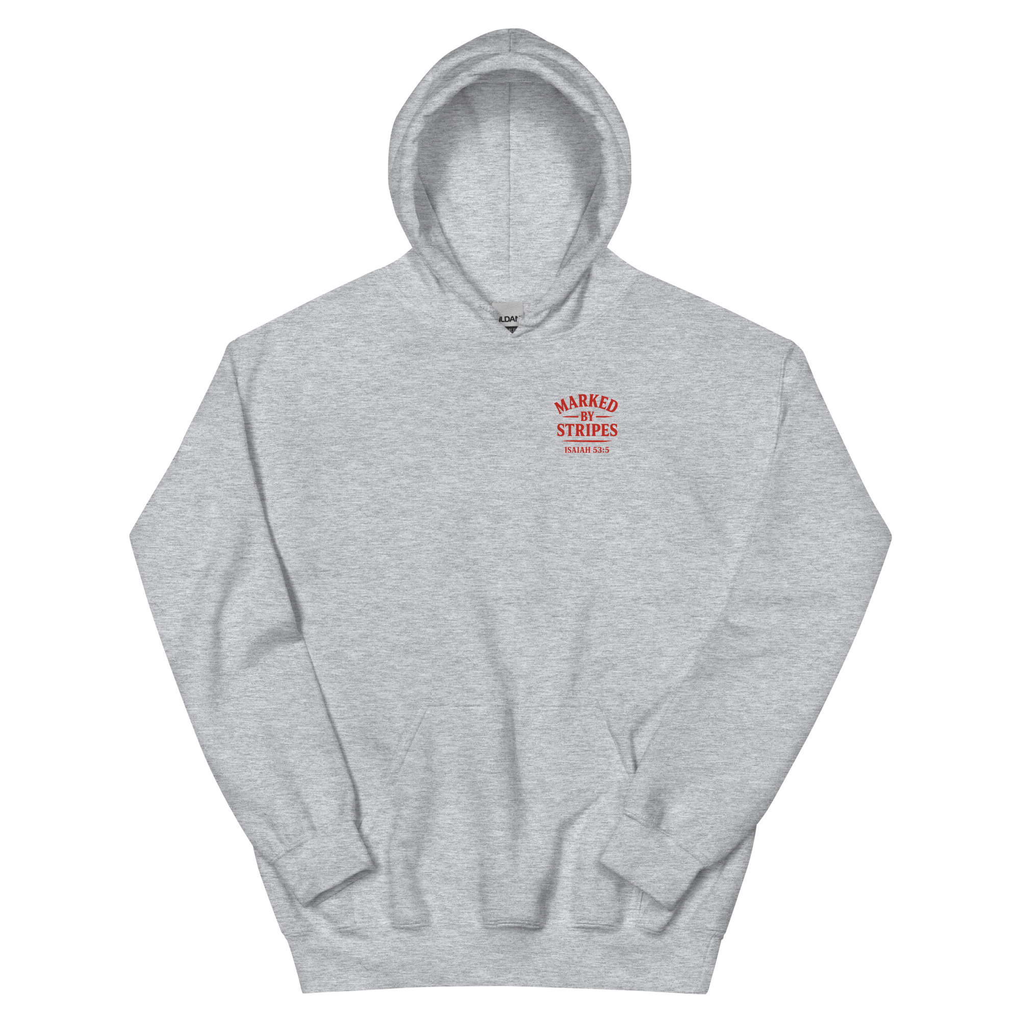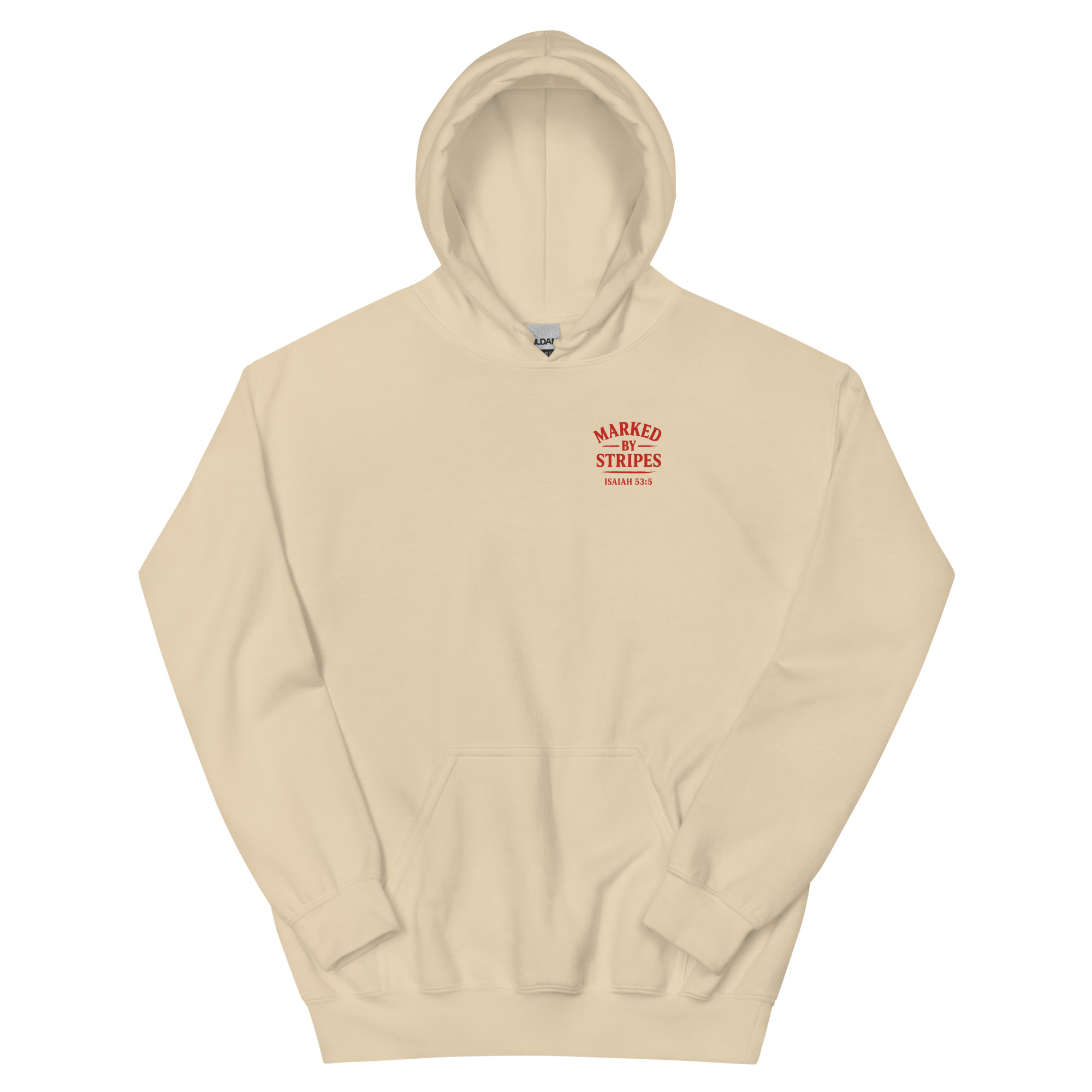 The front design features the Marked by Stripes logo, clean and restrained, representing identity shaped by Christ’s suffering rather than personal strength or performance.