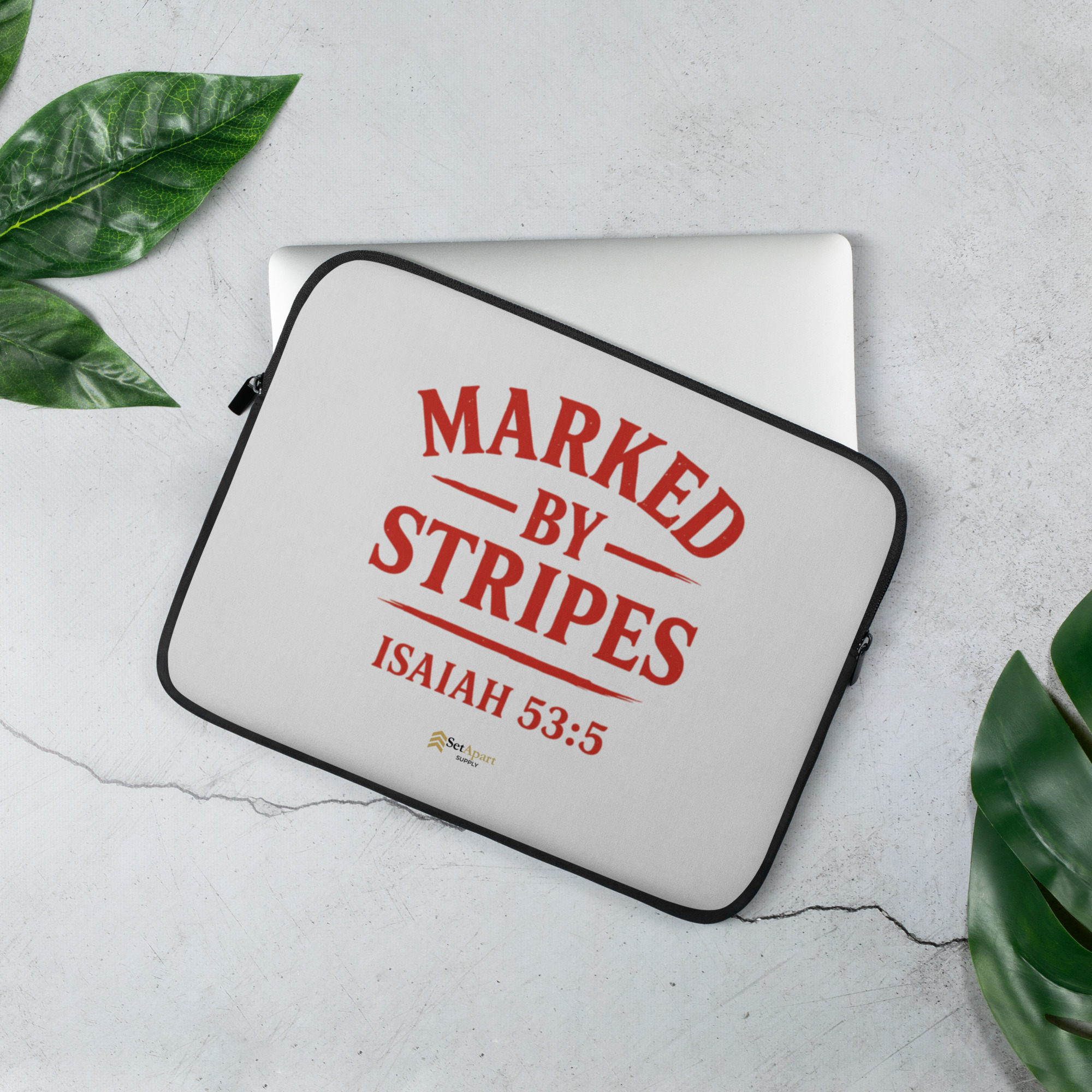 This sleeve carries that identity into modern spaces where faith and vocation intersect. Offices, classrooms, cafés, travel—places where conviction is lived quietly and consistently. The design remains clean and restrained, allowing the Marked by Stripes statement to stand on its own without explanation.