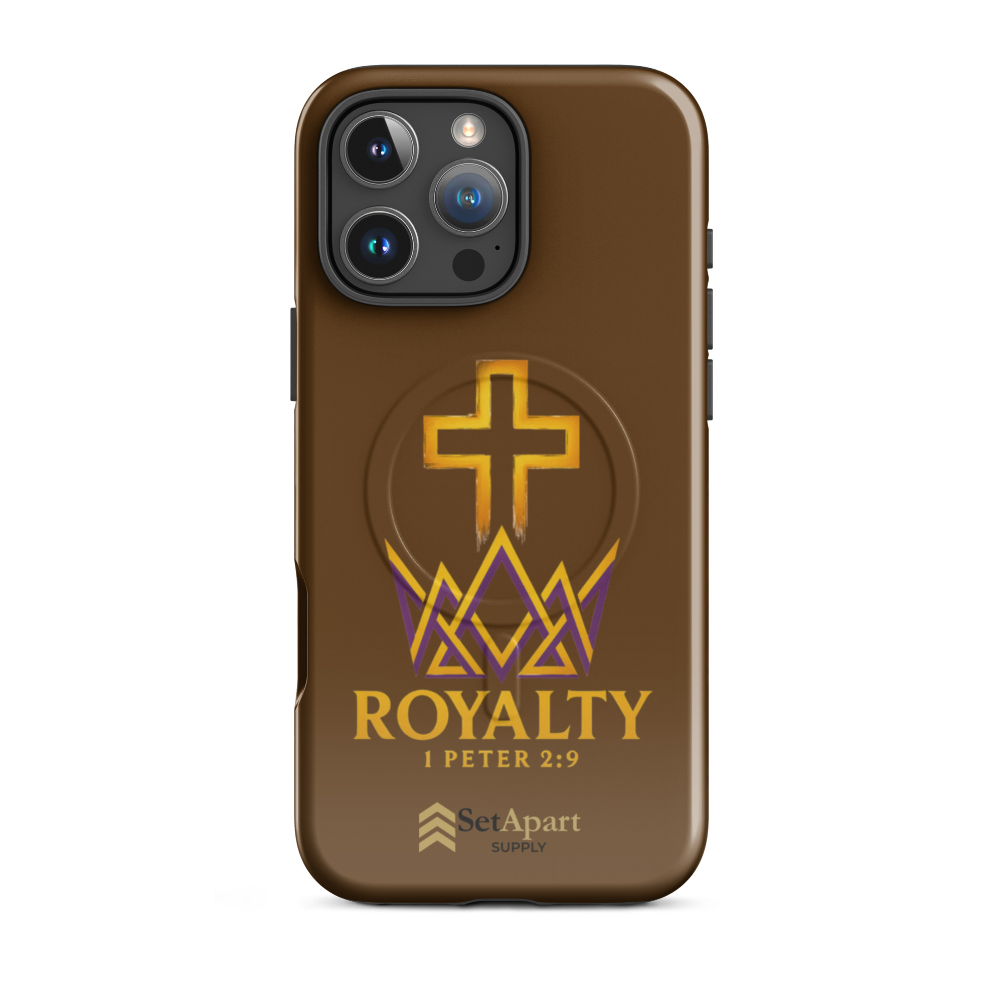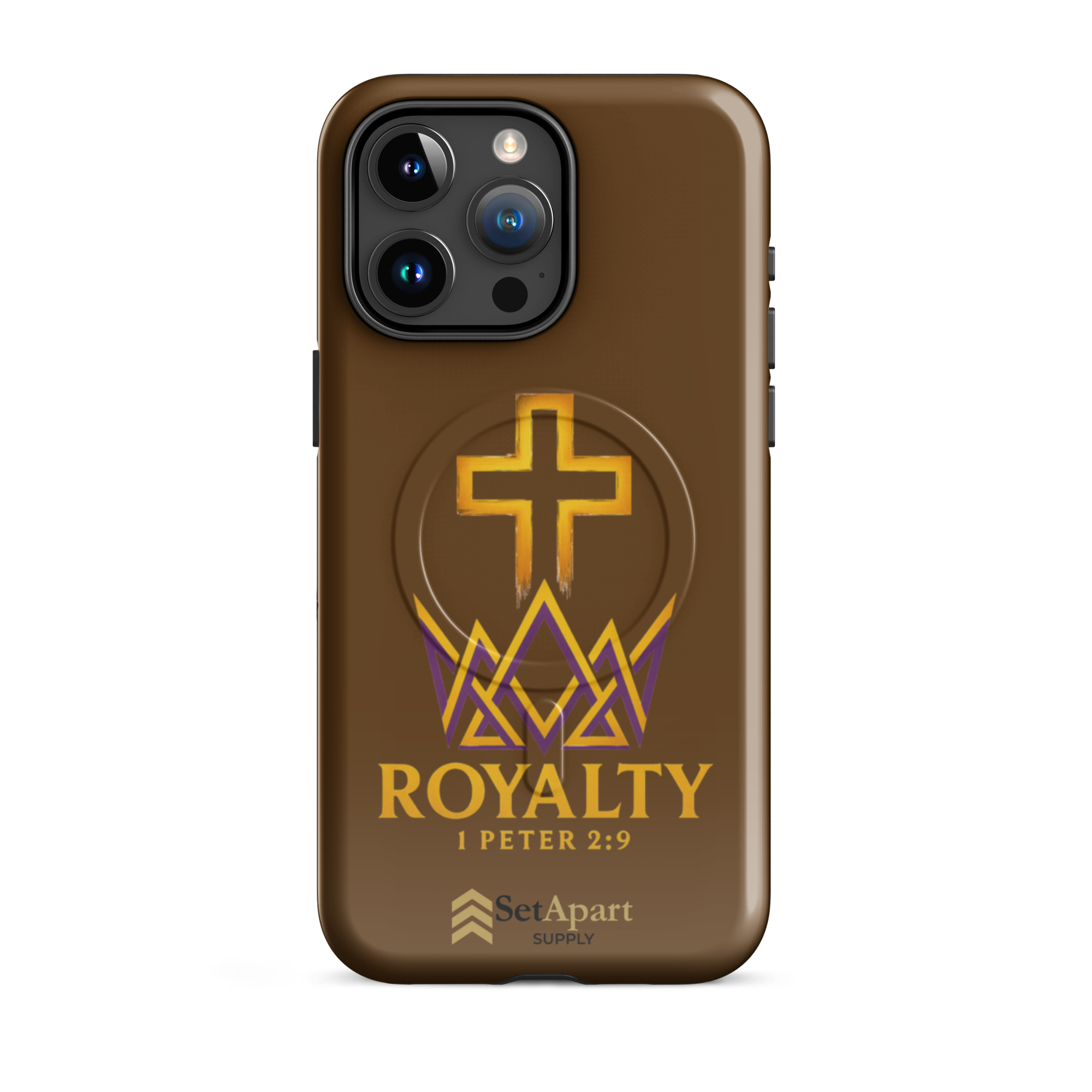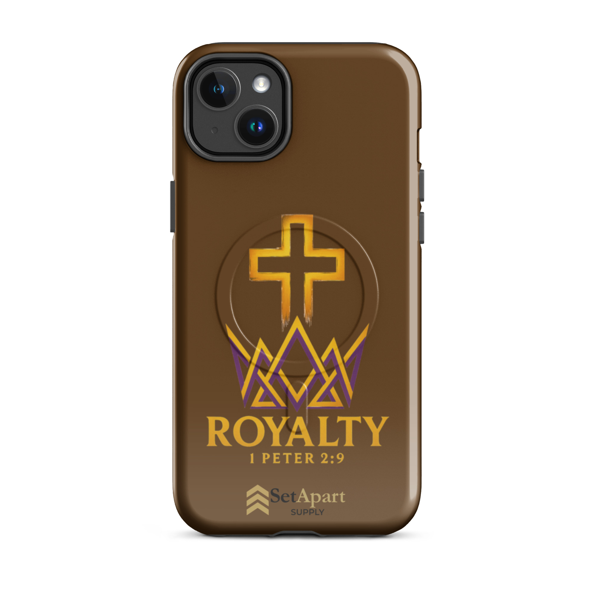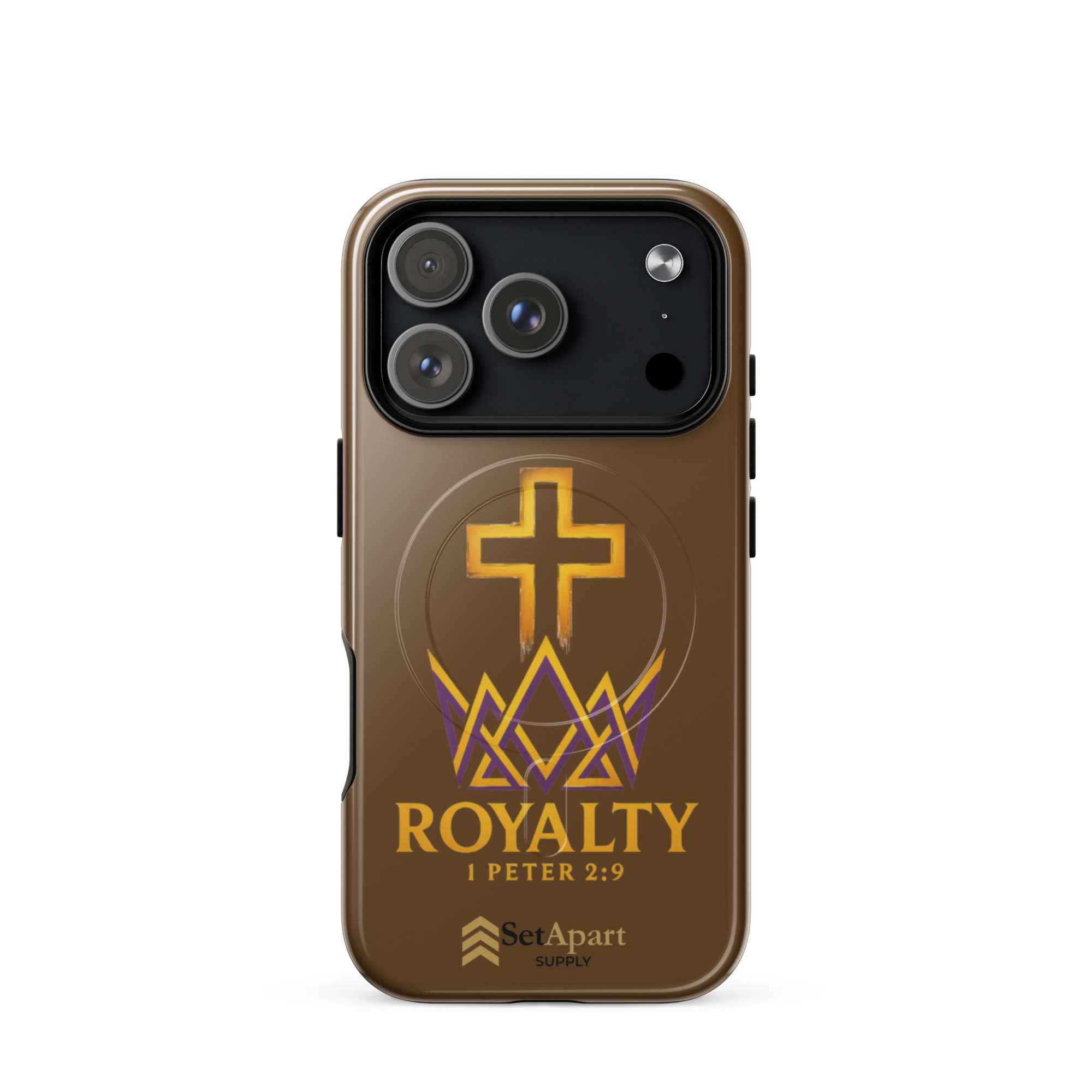 Anchored in 1 Peter 2:9, the case features the Royalty front graphic: a radiant golden cross positioned above a geometric crown. The hierarchy is intentional—the cross above the crown, alignment before authority. The design remains clear and centered, allowing conviction to speak without clutter.